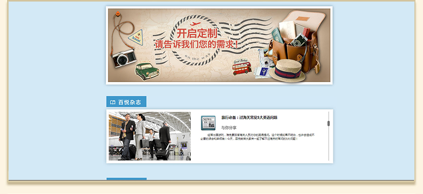 Project Description 百悦逸游于2012年初由二位资深的旅行家创办,是成都传媒集团旗下成都新闻国际旅行社有限公司的高端旅游品牌,总部位于成都高新区天府大道中段美年广场。在百悦逸游成立之前,创始团队亲自到全球三十多个国家实地考察,带着第一手的资讯和执着的信念创立了中国西部第一家真正意义上的私人定制旅行机构。百悦的旅行不是跟团挤大巴,不是十天去十个国家,更不是没完没了的... Official website address 襄阳http://www.100.travel I want to share